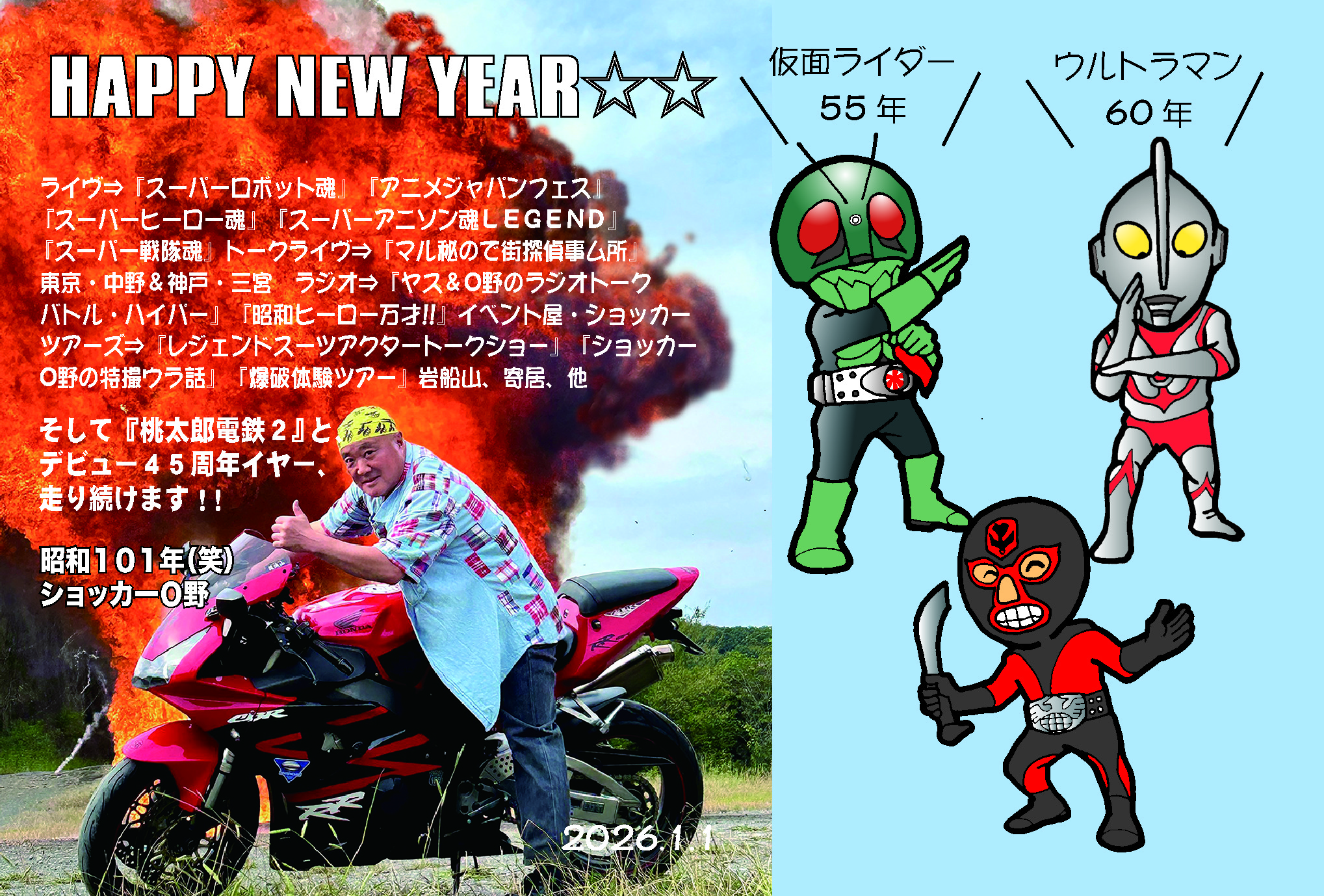 今年もヨロシクお願いしますm(_ _)m 一昨年、イベント屋・ショッカーツアーズを立ち上げ、『レジェンドスーツアクタートークショー』『特撮ウラ話』『爆破体験ツアー』他、いろんなイベントを企画・実施していく中で、昨年9月にデビュー45周年を迎え、より精力的な活動を決意し始めた年末、新宿を歩いている時に街頭インタビューを受け、「アナタにとっての今年の漢字は
